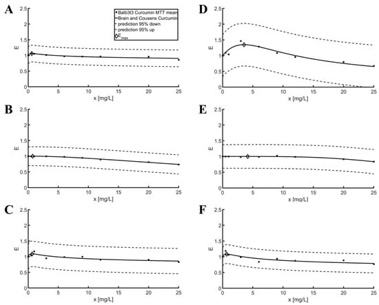 Brian and Cousens model curve fitting with 95% prediction bounds for the MTT assay. (A) Curcumin—Balb3t3; (B) Resveratrol—Balb3t3; (C) Baicalin—Balb3t3; (D) Curcumin—L929; (E) Resveratrol—L929; (F) Baicalin—L929.