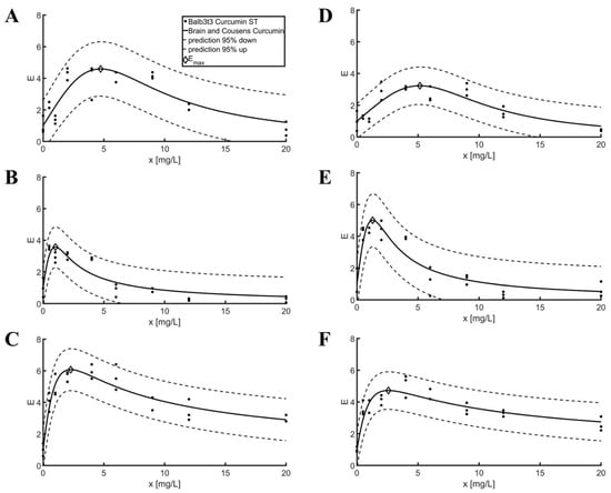 Brian and Cousens model curve adjustment for ST test. (A) Curcumin—Balb3t3; (B) Resveratrol—Balb3t3; (C) Baicalin—Balb3t3; (D) Curcumin—L929; (E) Resveratrol—L929; (F) Baicalin—L929.