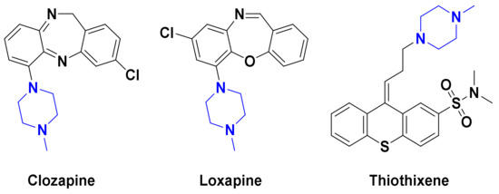 - Brito, A.F.; Moreira, L.K.S.; Menegatti, R.; Costa, E.A. Piperazine derivatives with central pharmacological activity used as therapeutic tools. Fund Clin. Pharmacol. 2019, 33, 13–24. [Google Scholar] [CrossRef]