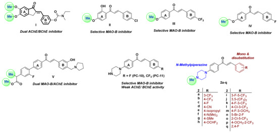 As part of our continued endeavors to develop novel chemical entities as potent MAO-B/or AChE inhibitors, we have recently reported compounds PC-10 and PC-11 as piperazine featuring chalcones with promising selective MAO-B inhibitors (Figure 2) [33]. Compounds PC-10 and PC-11 showed IC50 values of 0.65 and 0.71 μM, respectively, against MAO-B, with selectivity index (SI) of 48.3 and 49.2 over MAO-A. Furthermore, kinetics study of PC-10 and PC-11 revealed their competitive mode of MAO-B inhibition with inhibition constant (Ki) of 0.63 and 0.53 μM, respectively. However, these molecules exerted modest activity towards both AChE and BChE with IC50 values of 26.3–28.0 and 36.2–36.4 μM, respectively. Motivated by such findings, as well as the aforementioned considerations highlighting the significance of terminal methyl group (Figure 2), we pursued further structural modifications on compounds PC-10 and PC-11 aiming at design of dual MAO-B/AChE inhibitors with improved potency. Thus, in the current study, seventeen N-methylpiperazine chalcones were designed, synthesized, and biologically tested against MAO-A/B and AChE/BChE. We expected that insertion of the small bulky methyl group on the terminal amine of piperazine would impart AChE inhibitory activity for the target molecules. In addition, diverse mono- and di-substituted phenyl rings, with various lipophilic characters, were investigated to construct a reliable structure activity relationship (SAR) study. To the best of our knowledge, this is the first report harnessing N-methylpiperazine moiety to afford dual MAO-B/AChE chalcone inhibitors.