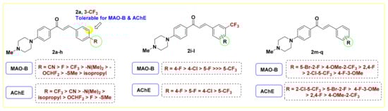 Referring to the disubstituted derivatives 2i–q, it was noticed that the existence of a four-halogen moiety (F/Cl) adjacent to meta-trifluoromethyl is optimal for MAO-B inhibition. For example, compound 2k bearing 3-trifluoromethyl-4-fluorophenyl showed superior potency against MAO-B (IC50 = 0.71 μM) compared to its 3,5-positional isomer 2i (IC50 = 2.33 μM). Upon comparing the 4-halogenated-3-trifluoromerthylphenyl derivatives 2k and 2l, it was found that 2k is relatively more potent than its corresponding 4-chloro congener 2l over MAO-B, AChE, and BChE. Such a finding is in agreement with the recent report of Rullo et al., which underscored the importance of fluorinated motifs in achieving sound MAO-B inhibition [38]. Worth noting is that replacing fluorine in 2i (IC50 = 2.33 μM) with a trifluoromethyl group (2j) led to dramatic drop in MAO-B inhibition (IC50 = 15.70 μM). In addition, the introduction of a 3-methoxy group, in place of the 3-trifluoromethyl motif of 2k, afforded the chalcone 2m with significantly reduced potency for MAO-B (IC50 = 6.76 μM), yet with reasonable inhibition towards AChE and BChE. Upon inspection of the activity of 2,5-disubstituted chalcones 2n and 2o, it was observed that compound 2o, the positional isomer of 2l, displayed a distinct multi-target inhibitory effect over MAO-B, AChE, and particularly BChE (IC50 = 1.19 μM). As an exception to the noticed dual selective MAO-B/AChE inhibition of this set of 4-methylpiperazine, the 2,4-difluoro member 2p elicited moderate MAO-A potency (IC50 = 6.67 μM) with a low SI value of 3.06. In view of these biochemical assay results and as illustrated in Figure 3, it is evident that both the nature and position of the substituent installed on terminal phenyl ring possess critical roles in modulating the inhibitory potency towards MAO-A/B and AChE/BChE.