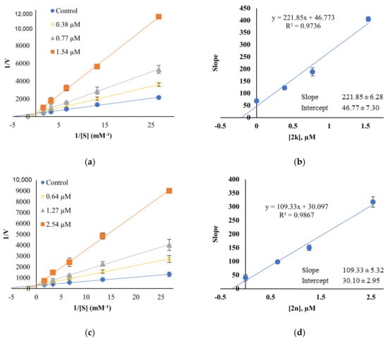 Lineweaver–Burk plots (a,c) and their secondary plots (b,d) of 2k and 2n for AChE. Five concentrations of ATCI were used; 0.0625, 0.125, 0.25, 0.5 and 1.0 mM, respectively, and three concentrations of inhibitor were ~1/2×, 1×, and 2 × IC50: 4.05, 8.10, and 16.20 µM for 2k; 2.16, 4.32, and 8.64 µM for 2n. The Km value for AChE was 0.075 mM.