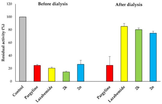 Reversibility tests of 2k and 2n for MAO-B using dialysis method. MAO-B was treated with ~2 × IC50 of pargyline (0.28 µM), lazabemide (0.22 µM), 2k (1.16 µM), and 2n (2.54 µM) before dialysis for 6 h. The residual activities were determined before and after dialysis to confirm the reversibility pattern using enzyme assay described in Materials and Methods.