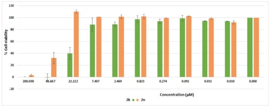 The cytotoxicity profile of 2k and 2n on the cellular viability of VERO normal cells was investigated at ten different concentrations (0.0102–200 µM), using MTT (3-(4,5-dimethylthiazol-2-yl)-2,5-diphenyltetrazolium bromide) assay. As depicted in Figure 7, compounds 2k and 2n were non-toxic to normal VERO cells with IC50 values of 19.93 µM and 62.04 µM, respectively, pointing out their suitability as potential therapeutic candidates.