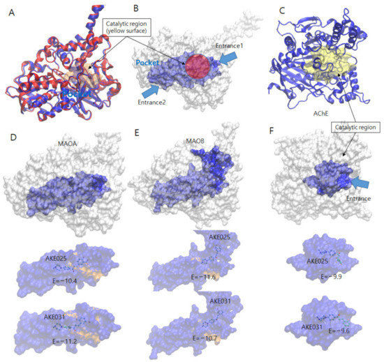 Molecular docking of 2k and 2n on MAO-A, MAO-B, and AChE. (A) Superimposed MAO family structure. Both structures are drawn by Cartoon model shaded by blue (MAO-A) and red color (MAO-B). The catalytic regions are drawn by transparent yellow surface model in the center. (B) Pocket and catalytic region of MAOs. The protein model is drawn by white surface model. MAO family structure has large pocket (blue surface model) in the center and connected to the catalytic region (red circle) in the center. The pocket has two entrances toward the catalytic regions (two blue arrows). (C) AChE protein structure drawn by blue cartoon model and yellow transparent surface model (catalytic region). The compound entrances toward the catalytic region are indicated by blue arrows. Docking simulation results of compounds 2k and 2n into MAO-A (D), MAO-B (E), and AChE (F). The MAOs structures are sketched by white sphere model and the binding pockets that exist on the center are shaded by blue color. The below panels show the binding pocket shade by transparent blue spheres for the existing compound to show. The binding catalytic regions are shown by transparent yellow colors. The compounds are bound in the pocket and near the catalytic region.