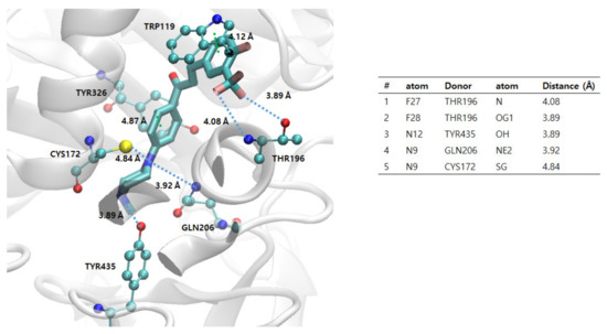 Docking simulations of the best two members 2k and 2n with MAO-A (pdb code: 2Z5X), MAO-B (pdb code: 4A79), and AChE (pdb code: 6O4W) were performed using AUTODOCK-VINA [40]. The catalytic sites of MAO-A, MAO-B, and AChE are highlighted, as depicted in Figure 8A, 8B, and 8C, respectively. Six combinations of docking simulations were performed (MAO-A-2k and MAOA-2n in Figure 8D, MAO-B-2k and MAO-B-2n in Figure 8E, and AChE-2k and AChE-2n in Figure 8F). The docked compounds were clustered based on their position on the protein. Each top lowest energy conformation in the catalytic region of the three proteins is tabulated in Table 3. Each lowest energy compound near the catalytic region is sketched, with their docking energies in Figure 8D–F. Among the generated conformations, compound 2k has the lowest energy with MAO-B (−11.6 kcal/mol), indicating the tightest binding which is consistent with the experimental IC50 value. That tight binding stems from the existence of several hydrogen bonding interactions (blue dash lines), as shown in Figure 9. The main key residues are THR196, GLN206, and TYR435, and the crucial interacting functional groups in 2k are CF3 and two nitrogen atoms in piperazine. Because the side chain of THR196 can rotate freely and stay in three conformers, Gauche+ (60° of torsional angle in N-CA-CB-OG1), Gauche- (−60°), and trans (180°), the hydrogen bonds of the donor, OG1 in THR196 could enhance its binding affinity toward the –CF3 of 2k. The nitrogen atom in the backbone of THR196 can also engage in hydrogen bonds with the –CF3. Two terminus atoms in the side chain (–NE2 for GLN206 and -OH for TYR435) can share binding interactions toward the two nitrogen atoms in the piperazine of 2k. Although the number of hydrogen bonds in MAO-B-2k is four hydrogen bonds, the MAO-A-2k also has four hydrogen bonds. However, MAO-B-2k possesses lower binding energy and the number of π-π interaction is two, as shown in Figure 8, which is higher than one in MAO-A-2k. Two π-π interactions are found between (1) TYR326 and the central planar ring, and (2) TRP119 and the fluorine aromatic ring. In particular, the first π-π interaction between TYR326 and the central ring of 2k plays an important role in inhibitory selectivity of MAO proteins. The MAO-B has TYR326, and the corresponding residue in MAO-A is ILE335. The structural difference confirms that the inhibitor selectivity of MAO-A and MAO-B is caused by π-π interaction [41]. The docking of compounds 2k and 2n on AChE had higher binding energies than the MAO series. However, AChE showed a higher number of hydrogen bonds and the same number of π-π interactions. Therefore, both compounds 2k and 2n could have tighter binding on AchE than the MAO-A protein. As revealed from the docking simulation results, compound 2k was the most favorable inhibitor in MAO-B in terms of the lowest binding energy and higher number of hydrogen bonds along with π-π interactions, and these results are in good agreement with the IC50 or Ki experiment results. In AChE inhibition, Ki results were not in accordance with the results of the docking data; 2n (Ki = 0.82 uM) bound more tightly on AChE than 2k (Ki = 1.44 uM), but differences in the docking data of AChE were smaller than those of MAO-B. This discrepancy might come from the difference in inhibition modes; AChE inhibition by 2k and 2n was mixed type with a different degree, while MAO-B inhibition was competitive. In addition, docking data were calculated based on a combination of various factors such as hydrogen bonding, electrostatic bonding, van der Waals forces, dissolvent effects, and the flexibilities of compounds [42]. Therefore, mixed inhibition degrees and microelement environments of the binding sites might influence the experimental Ki values, though docking values were not exactly in line with the Ki values.