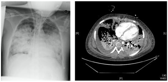 Left: Chest-X-Ray Day of illness #6 (DOI #6): Multiple bilateral pulmonary opacifications and lying ECMO cannula over the right internal jugular vein. Right: Chest-CT DOI#10: infiltrates on both sides with multiple pulmonary meltdowns and pleural effusions.