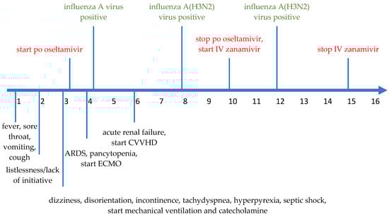At the time of decision in favor of compassionate use IV zanamivir treatment, the patient had already failed a seven-day course of oral oseltamivir treatment (75 mg BID) which had reportedly been started on day three of illness. On day four of illness, extracorporeal membrane oxygenation was started. On day six, CVVHD was initiated.