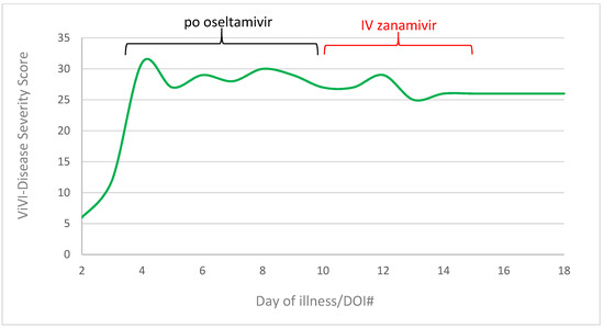 The peak (ViVI Disease Severity Score of 31, >99 percentile) was reached on day three of illness, when the patient was diagnosed with shock [21]. Under 7 days of oral oseltamivir therapy, ViVI-Scores had decreased slightly, from 31 to 27. During 5 days of IV zanamivir therapy, severity scores dropped further to a value of 26 (DOI#15) (Figure 3).