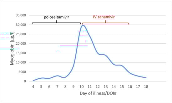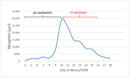 Myoglobin was on 400 µg/L on day four of illness. It increased to 29,002 µg/L on day ten of illness, when IV zanamivir was started.