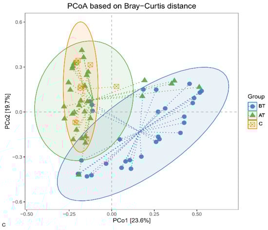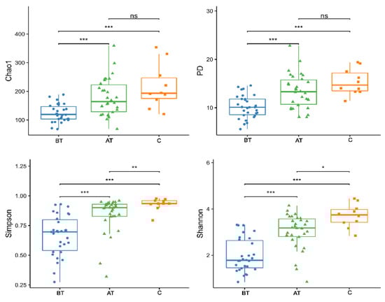 Alpha diversity indexes (Chao1, Simpson, PD, and Shannon) of the pre-treated (BT), after-treatment (AT), and control (C) groups. ns = no statistical significance, * = p <0.05, ** = p <0.01, *** = p < 0.001.