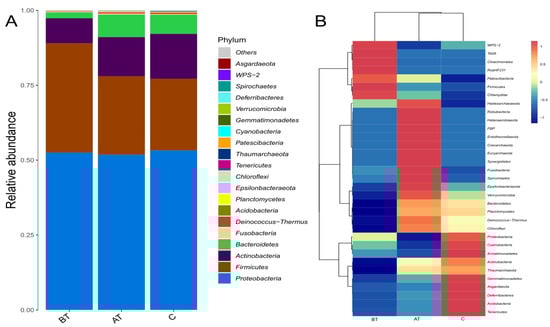 Relative abundance of facial microbiota at phylum level among the pre-treated (BT), treated (AT), and (C) acne groups (A): Barplot presenting mean relative abundance in terms of percentage among the three experimental groups. (B): The correlation heatmap presents relative abundance in percentage among the three experimental groups at the phylum level.