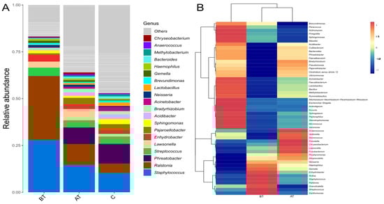 Relative abundance of facial microbiota at genus level among the pre-treated (BT), treated (AT), and control (C) groups. (A): Barplot presents relative abundance in percentage among the three experimental groups. (B): The correlation heatmap presents relative abundance in percentage among the three experimental groups at the genera level.