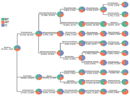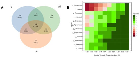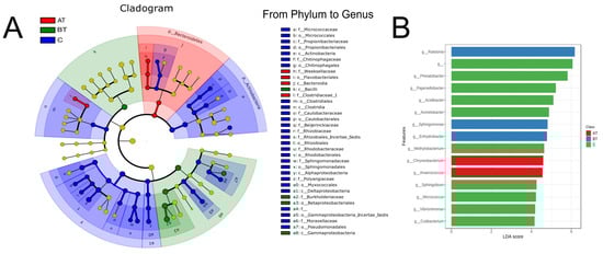 LEfSe analysis of the facial microbiota of pre-treated (BT), treated (AT), and control (C) acne groups. (A): Cladogram representation of statistically consistent differences (Phylum—genus) in the three groups. Each circle’s diameter is in proportion to that taxon’s abundance. (B): Enriched genera (LDA > 3.5) in the three groups.