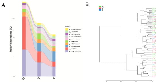 Difference between facial microbiota of the pre-treated (BT), treated (AT), and control (C) acne groups. (A): Sankey chart presenting the pattern of change in facial microbiota among the three experimental groups at the genus level. (B): Sample-wise similarity-based dendrogram of the three experimental groups.