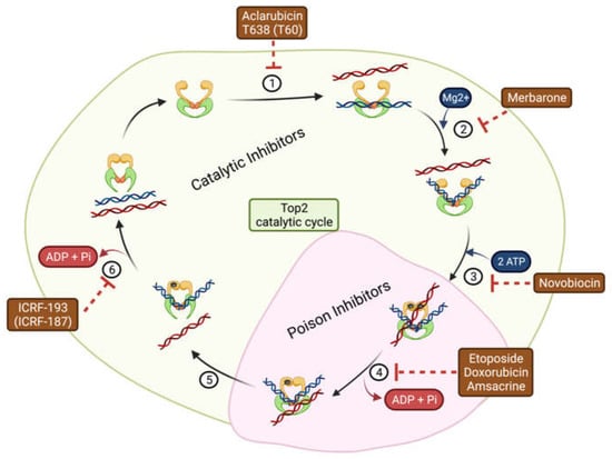 Catalytic Top2 inhibitors are chemicals that inhibit Top2 enzymatic activity. They block the enzyme before DNA breaks are carried out or after DNA re-ligation is completed. Therefore, they do not induce Top2cc accumulation. Due to the inability of Top2 to relax DNA supercoils or decatenate sister chromatids during mitosis, failed cell division and subsequent cell death can be established [,].