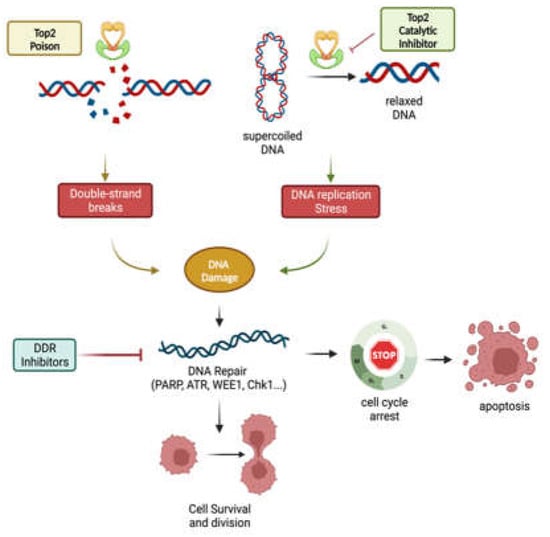 Synthetic lethality of Top2 inhibition in combination with DDR inhibitors. Top2 inhibition generates DNA damage during double-strand breaks or DNA replication stress. These perturbations to the cell can be abolished by DNA damage repair pathways, thus allowing the cell to survive. However, inhibiting the proteins involved in the repair mechanism can increase the efficacy of Top2 inhibitors by producing synthetic lethality. The figure was created on biorender.com.