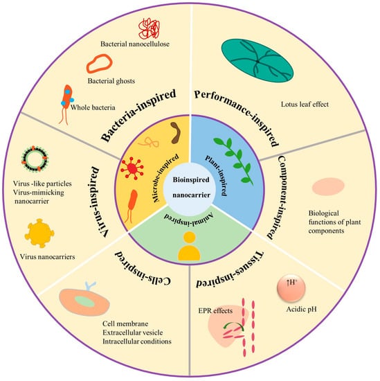 With the advancements in nanotechnology, the synthesis methods of nano-drug delivery systems have been rapidly developed. Bioinspired nanostructured systems been extensively exploited in the pharmaceutical field due to their properties of low toxicity, treatment effectiveness, and target ability. Based on the inspiration source and formulation, these bioinspired nanostructured systems were defined into three classes including microbe-inspired, plants-inspired, animal-inspired drug delivery systems (Figure 1). Inspired by biological functions and developed by mimicking their performance (shape, structure, appearance, locomotion, and surface) or utilizing their components to achieve their biological functions with the help of nanotechnology, bioinspired nanostructured systems have been a newer generation drug delivery system [10,11,12]. Since a large number of studies have been performed and we might not be able to grasp it comprehensively, we will focus on a few specific questions.