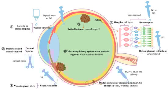 Applications of the bioinspired nanocarrier for ocular disorders: (1) Ocular infections: the inspirations include the acid environment produced by the bacteria, the temperature of humans, and the receptors expressed on the surface of the corneal epithelial cells. (2) Regenerative ophthalmology: the inspirations include stem cell-derived EVs, BNC, and BNC-loaded human stem cell-derived cells. (3) Eye tumors: the inspirations include the VLPs and the receptors expressed on the surface of tumor cells. (4) Retina-targeting gene therapy: the inspirations include the virus itself. (5) Ocular neovascular disease: the inspirations include the virus, cell membrane, and EVs. (6) Other drug delivery systems to the posterior eye: the inspirations include the VLPs, the special environment of the ocular disorders, and the receptors expressed on the surface of corneal epithelial. Abbreviations: IVI, intravitreal injection; VLP, virus-like particle; SR, subretinal; IV, intravenous; CNV, choroidal neovascularization; RNV, retinal neovascularization; EVs, extracellular vesicles; BNC, bacterial nanocellulose.