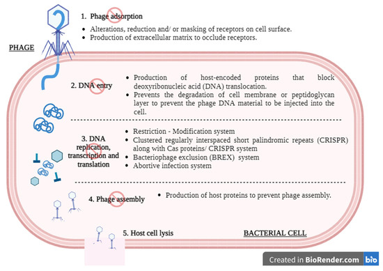A schematic illustration of the mechanism of phage resistance in relation to the general lytic phage cycle. (1) Phages can attach to the surface of host bacteria using receptor-binding proteins (RBPs). Bacterial cells have various ways to disrupt this attachment process, such as by alternating, reducing, and/or masking their receptors on the surface of the cell. (2) During translocation, phage DNA is directly injected into the host cell’s cytoplasm. Certain bacterial strains can hinder this injection by employing proteins encoded by the host that interfere with the transfer of phage nucleic acid. (3) Once inside the host cytoplasm, phage DNA undergoes preparation for replication. Whether the phage DNA is modified or unmodified, it can be degraded by host-encoded proteins following its translocation into the host cytoplasm. Normally, replication, transcription, and translation of the phage DNA will proceed as usual. However, bacterial cells may be able to resist this action through the initiation of the Restriction–Modification system, the CRISPR system, the BREX system, or the abortive infection system. (4) Assembly and packaging are crucial steps in the production of new phage particles. Certain bacterial strains express proteins that interfere with the assembly or packaging process of the newly synthesized virions. These proteins disrupt the proper formation of the phage capsid or the packaging of phage DNA into the capsid. (5) If the lytic phages manage to pass through all the bacterial defenses, it will eventually lead to host cell lysis. Created with Biorender.com.
