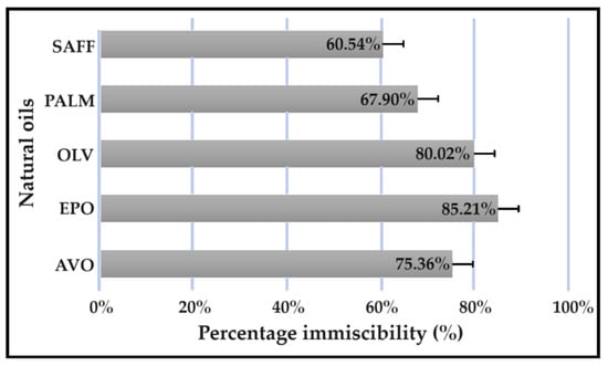 Immiscibility percentage of individual natural oils mixed with a combination of Transcutol®:PEG (9:1).