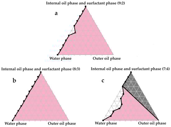 Pseudoternary phase diagrams of palm oil and set ratios of the chosen surfactant and internal oil phases. In (a) the internal oil and surfactant phases are combined in a ratio of 9:2; in (b) the internal oil and surfactant phases are blended in an 8:3 ratio; and in (c) the internal oil and surfactant phases are included as a 7:4 ratio.