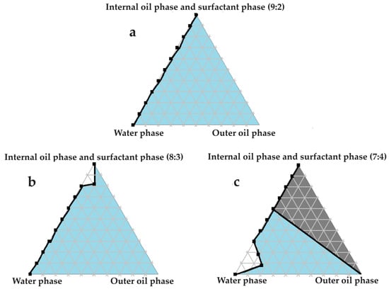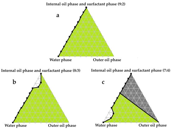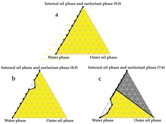 Pseudoternary phase diagrams of water, evening primrose oil, and secure fractions of the surfactant and internal oil phases. In (a) the internal oil and surfactant phases consist of a 9:2 ratio; in (b) the internal oil and surfactant phases comprise an 8:3 ratio; and in (c) the internal oil and surfactant phases are combined in a 7:4 ratio.