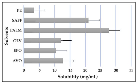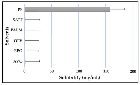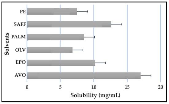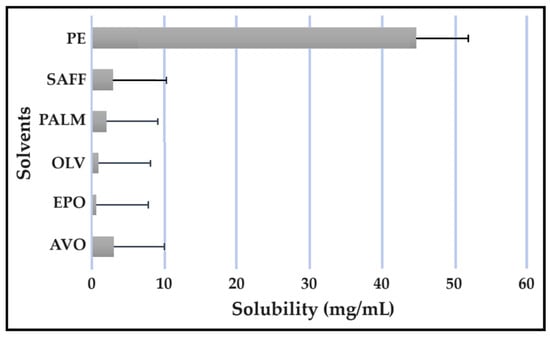 Solubility studies are crucial for determining the amount of excipients needed to best solubilize different drug combinations, while maintaining concentrations close to saturation to enhance the driving force needed to achieve dermal diffusion [4,6,19]. The solubility of antitubercular drugs was determined for the following solvents: AVO-, OLV-, EPO-, PALM-, SAFF, and PE, comprising a 9:9:2 ratio (internal oil phase:water phase:surfactant phase), as displayed in Figure 8, Figure 9, Figure 10 and Figure 11. The results are expressed as mean ± SD (n = 3).
