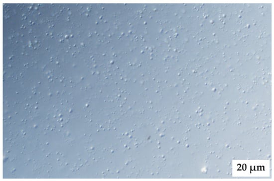 Evaluation of the PEs by microscopic examination revealed that the PE ratio of 9:9:2 (internal oil phase:water phase:surfactant phase) was the only PE that exhibited droplet formation. This supports the decision to exclusively use this ratio, and only vary the external oil phase according to the antitubercular drugs included in the SDEDDSs. The microscopic image was captured without any drugs present, as shown in Figure 12.