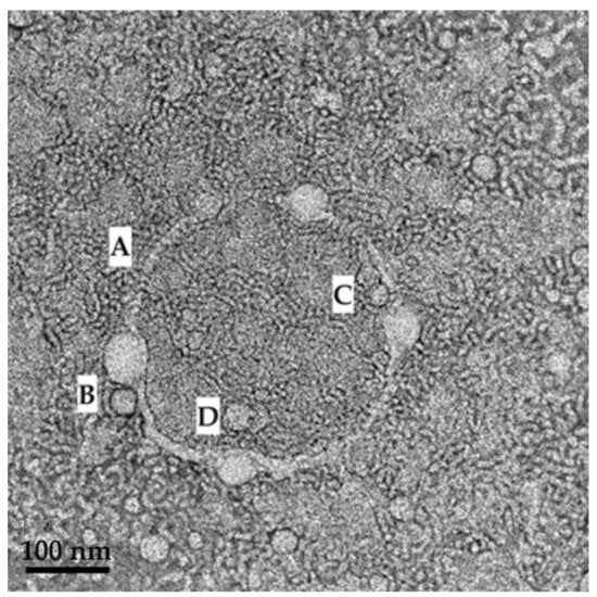 TEM image revealing the mechanism of SDEDDS formation where (A) a membrane structure is established by the surfactant phase; (B,C) and then water is engulfed by the surfactant phase so as to form small droplets inside the internal oil phase. (D) indicates where larger droplets harbor smaller droplets inside.