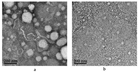 As seen in Figure 15a,b, SEDDS is presented as the (a) PE included in (b) SDEDDS. The most noticeable difference is in droplet size, since (a) rendered an average droplet size of 173.90 nm and (b) depicted an average droplet size of 92.46 nm. Interestingly, PDI values signify that (a) is more homogenous compared to (b). However, upon visual examination, (b) seems to be a sample of increased homogeneity compared to (a). This can be attributed to the observation made previously that only large droplets of SDEDDS were measured during droplet size determination due to the incorporation of smaller droplets inside the larger droplets. However, in terms of drug delivery, the TEM images indicate multiple phases presented by SDEDDSs compared to SEDDSs are able to incorporate more than one drug. This is due to the different phases established by water and two immiscible oils than can solubilize polar and non-polar drugs in the same vehicle with potential sustained release characteristics. This aspect requires further examination. TEM images were captured in the absence of drugs, since the red discoloration caused by both CFZ and RIF limits the contrast required for identification of SEDDS and SDEDDS, respectively. Therefore, the importance of preformulation studies during the development of SDEDDSs is emphasized and can be considered the key to success. This is indeed a novel development. To the knowledge of the authors, this represents the first nano-SDEDDS (N-SDEDDS) or W/O/O self-nano-emulsifying drug delivery system (SNEDDS) capable of incorporating four individual drugs that possess strikingly different physicochemical properties.