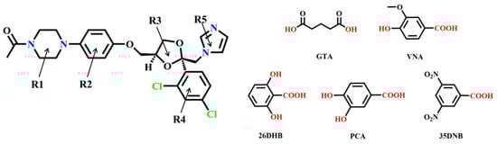 To date, crystal structures of KTZ salt with oxalate and cocrystals with some organic acids have already been reported [30,31,32,33,34]. The choice of CCFs was based on the following considerations: on the one hand, based on the supramolecular homosynthon and heterosynthon, considering the existence of imidazole and a piperazine ring in the KTZ structure and the high persistence of COOH/OH. . .N synthons in cocrystals between the nitrogen heterocycle complex and dicarboxylic and phenolic acids [14,35,36,37,38], we were encouraged to investigate the possibility of KTZ cocrystallization with dicarboxylic acids and phenolic acids. It is likely to form (C=O)−O−H. . .N heterosynthons when co-crystallizing KTZ with carboxylic acids. On the other hand, GTA, VNA, 26DHB, and PCA were selected from the generally regarded as safe (GRAS) compound list approved by the Food and Drug Administration [39], which is feasible in terms of pharmaceutical development. Furthermore, the solubility of CCFs used in this study is significantly higher than that of KTZ raw material, which has the potential to improve the solubility of KTZ. Five novel multi-components including four cocrystal forms with glutaric acid (GTA), vanillic acid (VNA), protocatechuic acid (PCA), 3,5-dinitrobenzoic acid (35DNB), and one salt form with 2,6-dihydroxybenzoate anion (26DHB), namely, KTZ−GTA, KTZ−VNA, KTZ−PCA, KTZ−35DNB, KTZ−26DHB in 1:1 stoichiometry have been successfully synthesized.