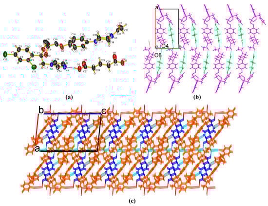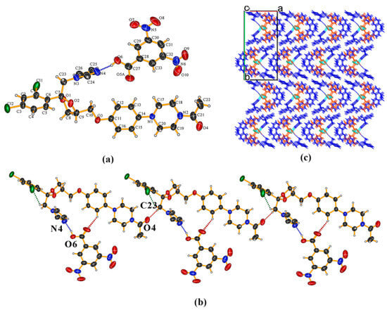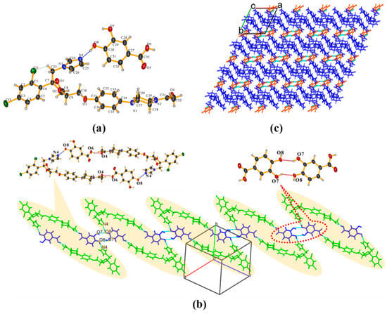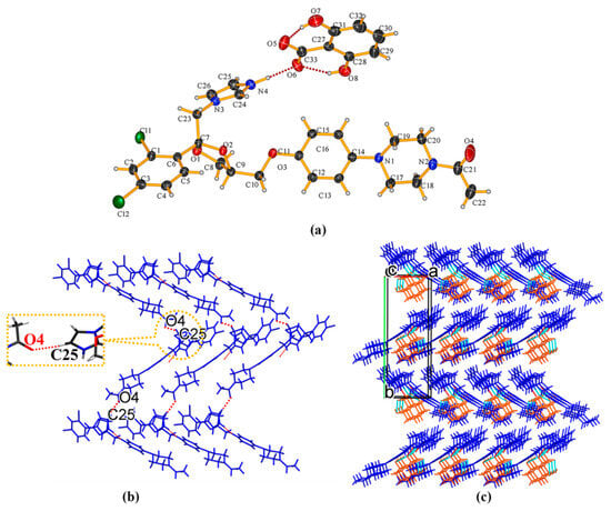 (a) Hydrogen-bonding interactions in an asymmetric unit; (b) adjacent asymmetric units connected via C23−H23···O4 hydrogen bonds between two KTZ molecules; (c) crystal packing diagram viewed along the crystallographic c-axis.