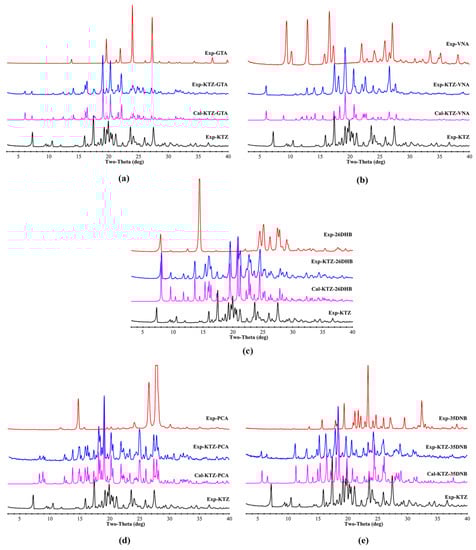The PXRD patterns of KTZ, the experimental and simulated multi-components, and the five CCFs are illustrated in Figure 7. It can be seen that the featured diffraction peaks of the starting materials cannot be detected in the patterns of the corresponding cocrystal samples. All the experimental patterns are consistent with those calculated from the simulated result of the SCXRD data, indicating that the powder samples possess satisfactory phase purity.