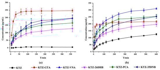 The solubility of KTZ exhibits strong pH dependence and is practically insoluble at higher pH values but is sparingly soluble under acidic conditions. The powder dissolution behaviors of KTZ and its five multi-components were investigated in ultrapure water and acetate buffer solution (pH 4.5), and the dissolution profiles are displayed in Figure 9. The results showed that the release of KTZ was faster, and the maximum solubility was significantly higher from all five multi-components than from KTZ alone in both media, which could mainly be attributed to the higher solubility of the CCFs and the dissociation behaviors of the multi-components. Consistent with equilibrium solubility, both KTZ−26DHB and KTZ−35DNB remained stable after the powder dissolution experiments, while the other three solid forms all dissociated into the KTZ free base (Figure S6b). The trend of the dissolution profile for each of the multi-component crystals is the same in both media. The solubility of the CCF and solid-form stability in solution are two important parameters for dissolution, such that less stable and dissociable multi-components are reported to possess higher solubility than their stable counterparts [56]. Although the solubility of KTZ in pure water is significantly improved, the equilibrium solubility of KTZ in acidic media is not significantly improved. Whether the improvement of solubility and dissolution rate of the obtained multi-components leads to the increase in the oral bioavailability of KTZ needs to be further confirmed.