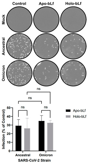 Overall antiviral effect of apo- or holo-bLf on SARS-CoV-2 infection. Vero cells were treated with 1 mg/mL apo- or holo-bLf throughout the infection procedure (i.e., before, during and after virus addition). At 72 h post-infection, cells were stained (top) and plaques were counted (bottom) to determine the efficiency of infection in relation to untreated cells (control). Data were obtained from three independent experiments in triplicates and plotted as mean ± standard deviation. No statistically significant differences between the groups were detected (ns: p > 0.05).