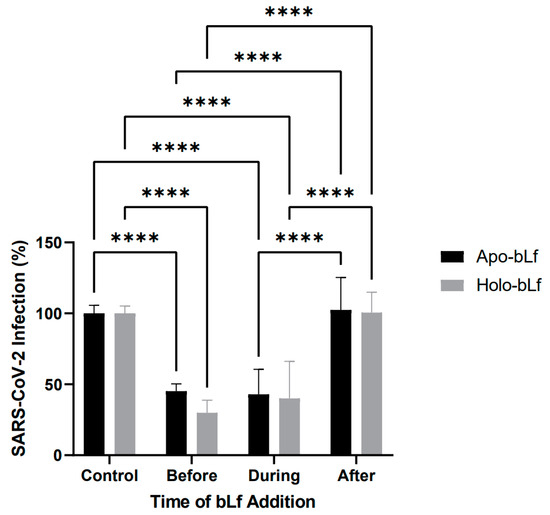 To assess at which stage of SARS-CoV-2 infection bLf acts, Vero cell monolayers were incubated with 1 mg/mL apo- or holo-bLf before, during or after the infection procedure, or untreated as a control (Figure 2). There was a great reduction in the percentage of virus infection when either of the protein forms were added before (~55% and ~70% for apo- and holo-bLf, respectively) or during (~57% and ~60% for apo- and holo-bLf, respectively) the infection procedure. However, no significant reduction in the percentage of virus infection was observed when either of the protein forms were added after the infection procedure. There were also no significant differences between the percentages of virus infection when comparing the effects of apo- and holo-bLf.