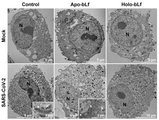 Inhibition of SARS-CoV-2 entry by apo- or holo-bLf. An ultrastructural analysis was performed in Vero cells either untreated (control) or treated with 1 mg/mL apo- or holo-bLf for 30 min during virus adsorption at 4 °C. After incubation for an additional 30 min at 37 °C, cells were dissociated and processed for transmission electron microscopy. SARS-CoV-2-infected cells were compared to mock-infected cells to assess the effect of virus entry on cell morphology. Images are representative of at least 14 cells for each condition (N: nucleus; *: intracellular vesicle; black arrow: plasma membrane projection; white arrow: SARS-CoV-2 particle).