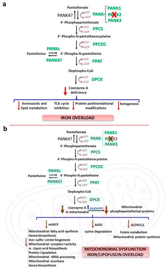 - Alvarez-Cordoba, M.; Fernandez Khoury, A.; Villanueva-Paz, M.; Gomez-Navarro, C.; Villalon-Garcia, I.; Suarez-Rivero, J.M.; Povea-Cabello, S.; de la Mata, M.; Cotan, D.; Talaveron-Rey, M.; et al. Pantothenate Rescues Iron Accumulation in Pantothenate Kinase-Associated Neurodegeneration Depending on the Type of Mutation. Mol. Neurobiol. 2019, 56, 3638–3656. [Google Scholar] [CrossRef]