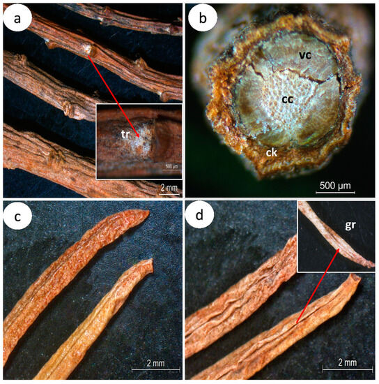 Macroscopic characteristics of Campylanthus glaber, aerial parts: (a) general aspect of the stem branches with the presence of trichomes (arrow) in the younger branch nodes; (b) cross-section section of the stem branch with details of the cork region and vascular cylinder; (c) leaf abaxial view; (d) leaf adaxial view with detail of groove (arrow) formed by revolute margin covered by trichomes. Abbreviations: cc: central cylinder; ck: cork; vc: vascular cylinder; tr: trichomes.