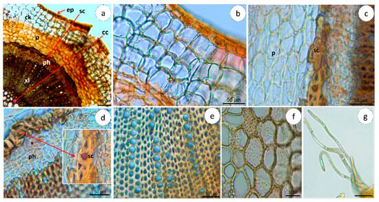 In cross-sections, the stem shows a typically cylindrical format (Figure 2b and Figure 3a), organized into the periderm, cork, and vascular cylinder (Figure 3a) from outside to inside. In the periderm, the phellem region of about 4–7 rows of quadrangular-shape cork cells (Figure 3b, Table 1), followed by a parenchyma region (Figure 3a), is below a one-layer epidermis covered with a striate cuticle. The cortex region is characterized by the presence of a circular layer of grouped sclereids (sclerenchyma) with thick walls (3.28–10.17 µm) (Figure 3a–c, Table 1) surrounding the vascular cylinder, mainly occupied by a broad xylem with 2–8 rows of vessels (82.1–324.1 µm2) (Figure 3a–e, Table 1), a narrow phloem (Figure 3a–d), and a central cylinder with large (770.9–4340.5 µm2) thick-walled cells (Figure 3f, Table 1). Few trichomes were observed; however, they are rarely present (Figure 3g).