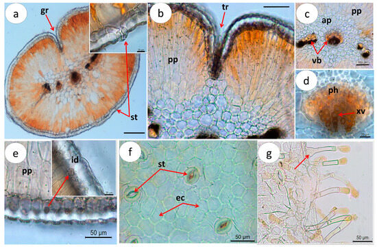 Microscopic characteristics of Campylanthus glaber leaf. (a) Cross-section of the midrib showing the cylindrical mesophyll with detail of stomata (arrow (st)) and groove (arrow (gr)); (b) detail of trichome (arrow) located in the groove formed by the curved margins and palisade parenchyma; (c) vascular bundles (arrows) embedded in the aquifer parenchyma; (d) xylem vessels (arrow) and phloem; (e) idioblasts (arrow) with calcium oxalate microcrystals; (f) epidermal cells (arrows (ep)) and anomocytic-type stomata (arrows (st)); (g) trichomes located on the leaf margins with detail of trichomes with swollen base (arrow). Abbreviations: ap: aquifer parenchyma; ec: epidermal cells; gr: groove; id: idioblast; pp: palisade parenchyma; ph: phloem; st: stomata; vb: vascular bundle; xv: xylem vessel. Scale bars: (a) = 200 µm; (b,c) = 100 µm; (d) = 20 µm; (e–g) = 50 µm.