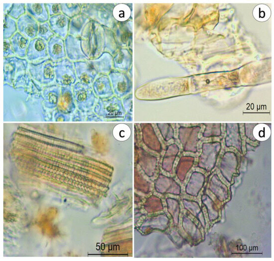 Microscopic characteristics of C. glaber aerial part powder. (a) Fragmented leaf epidermal cells with stomata and idioblasts with microcrystals; (b) protective trichome; (c) fragment of pitted vessels; (d) fragment of the stem central cylinder.