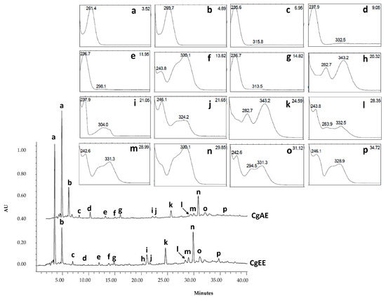 LC/UV-DAD profile of CgAE and CgE with UV spectra and retention times of the main marker classes of compounds identified: organic acids (peaks (a,b)), iridoid glucosides (peaks (c–e,g)), caffeoyl phenylethanoids glycosides ((f,j,l–p)) flavonoids (peaks (h,k)), and an unknown compound (i). Abbreviations: CgAE: Campylanthus glaber aqueous extract; CgEE: Campylanthus glaber ethanolic extract.