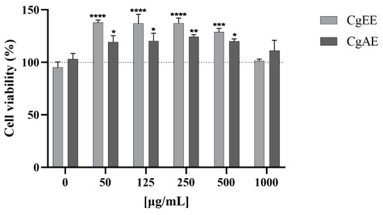 Neither CgAE nor CgEE cause cell death at any of the concentrations tested (50, 125, 250, 500, and 1000 µg/mL). On the other hand, an increase in the viability/proliferation of HepG2 was observed for both extracts at concentrations up to 1000 µg/mL when compared to the negative control (0 µg/mL). CgAE induced up to an approximately 24% increase in cell viability/proliferation, while CgEE induced an approximately 37% increase in viability/proliferation.