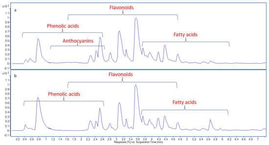 Base peak chromatograms of onion peels; RO (a) and YO (b) methanol extracts in negative ionization mode.