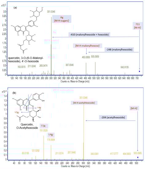 Acetylated quercetin glycosides: A deprotonated molecule at m/z 667.15 [M−H]− and the neutral loss of 204 amu of acetylhexosyl moiety yielding the product ion at m/z 463 [M−H−hexosyl acetate]−, which showed a subsequent neutral loss of 162 amu of hexosyl moiety, was tentatively identified as quercetin-O-hexoside-O-acetylhexoside (30). A deprotonated molecule at m/z 711.1403 [M−H]− and the neutral loss of 248 amu of malonylhexosyl moiety that was observed in MS2 fragmentation at m/z 463 [M−H−malonylhexosyl]− with another neutral loss of 162 amu of hexosyl moiety was proposed as quercetin, O-(O-malonyl-hexoside), O-hexoside (31) (Figure 2a). In the same manner, quercetin-O-acetylhexoside (41) (Figure 2b) and O-galloylquercitrin (45) were identified.