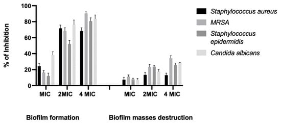 2.3. Inhibition of Biofilm Formation and Destruction of Biofilm Masses