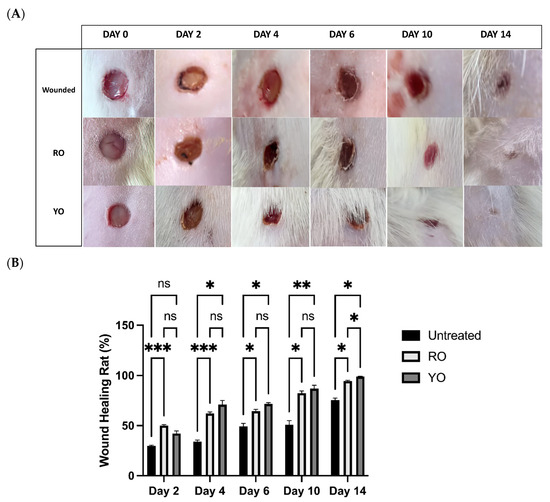 Wound healing and tissue repair in rats treated with RO and YO peel extracts. (A): Optical images; (B): Wound healing rate % at 0, 2, 4, 6, 10, and 14 days. Data are presented as mean ± SEM. Significance is considered at p < 0.05. The quantity of asterisks (*) denotes the degree of significance; (*): p < 0.05, (**): p < 0.01, (***): p < 0.001; ns: no significance.