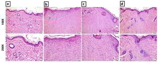Photomicrographs of skin (H&E) showing (a) negative control group: normal skin; (b) wounded group: wound area filled with granulation tissue and complete re-epithelization; (c) RO-treated group: filling of wound area with collagen-rich tissue and complete re-epithelization; (d) YO-treated group: contracture of the wound area with complete re-epithelization.